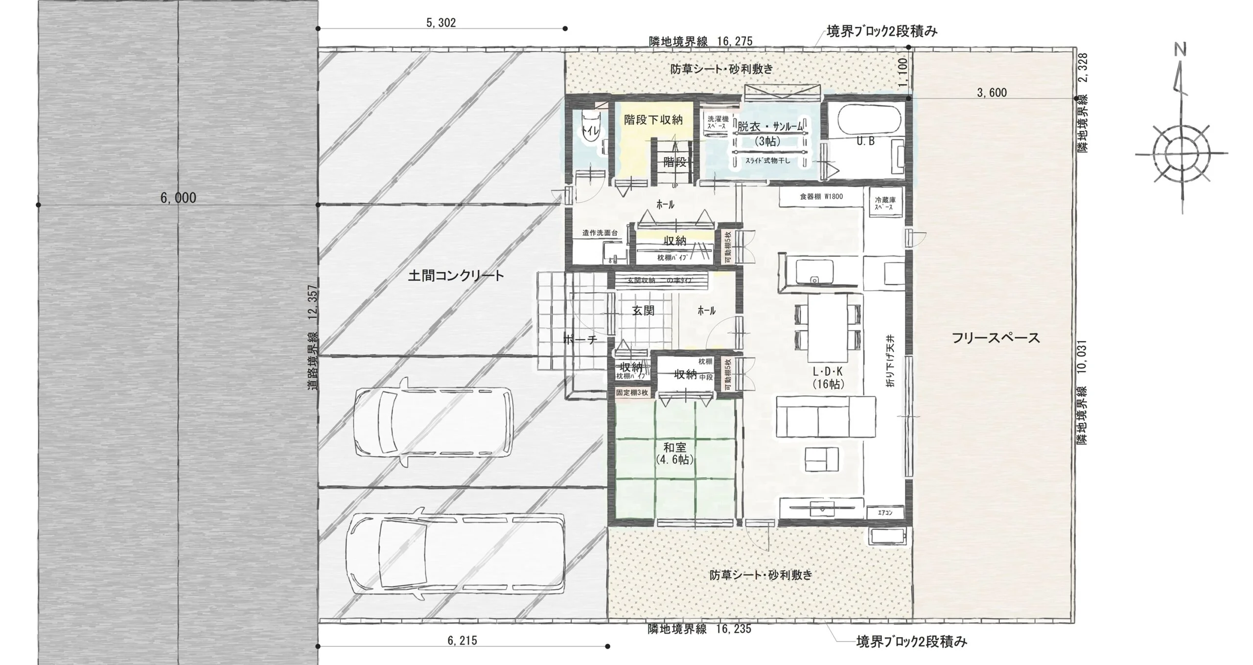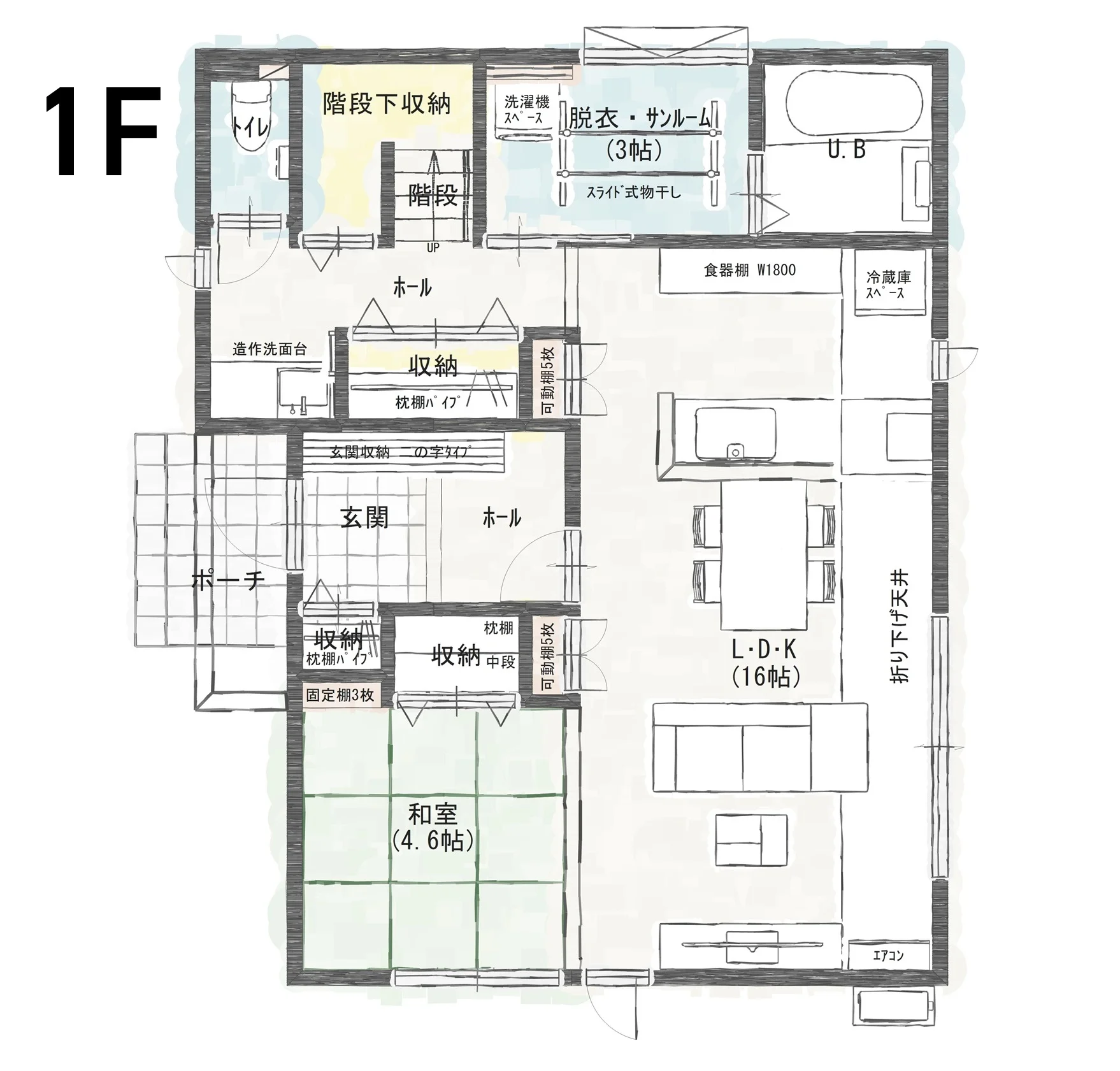 また、脱衣・サンルームにはスライド式の物干しを設置し、室内を広く有効活用できる工夫がされています。