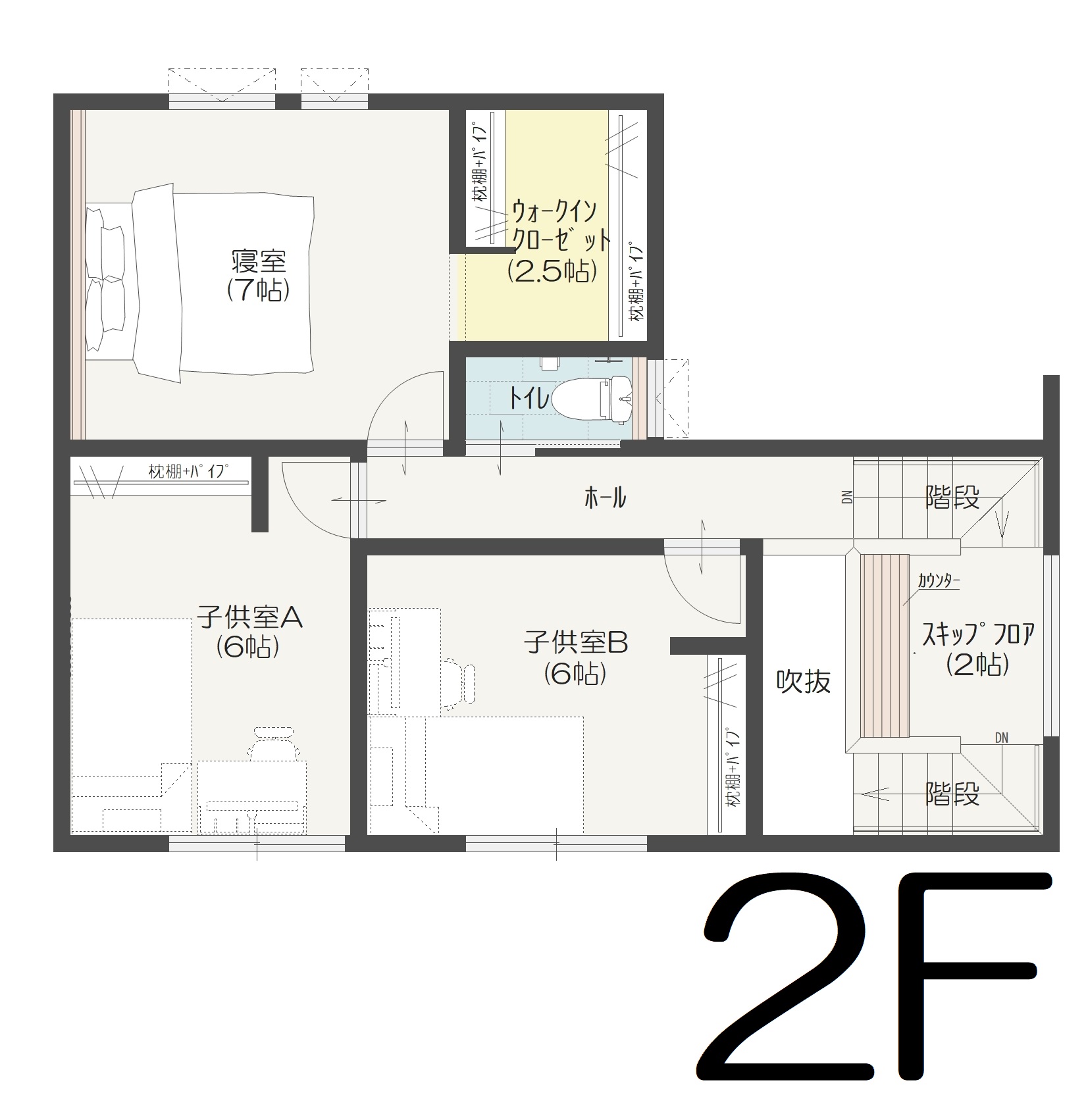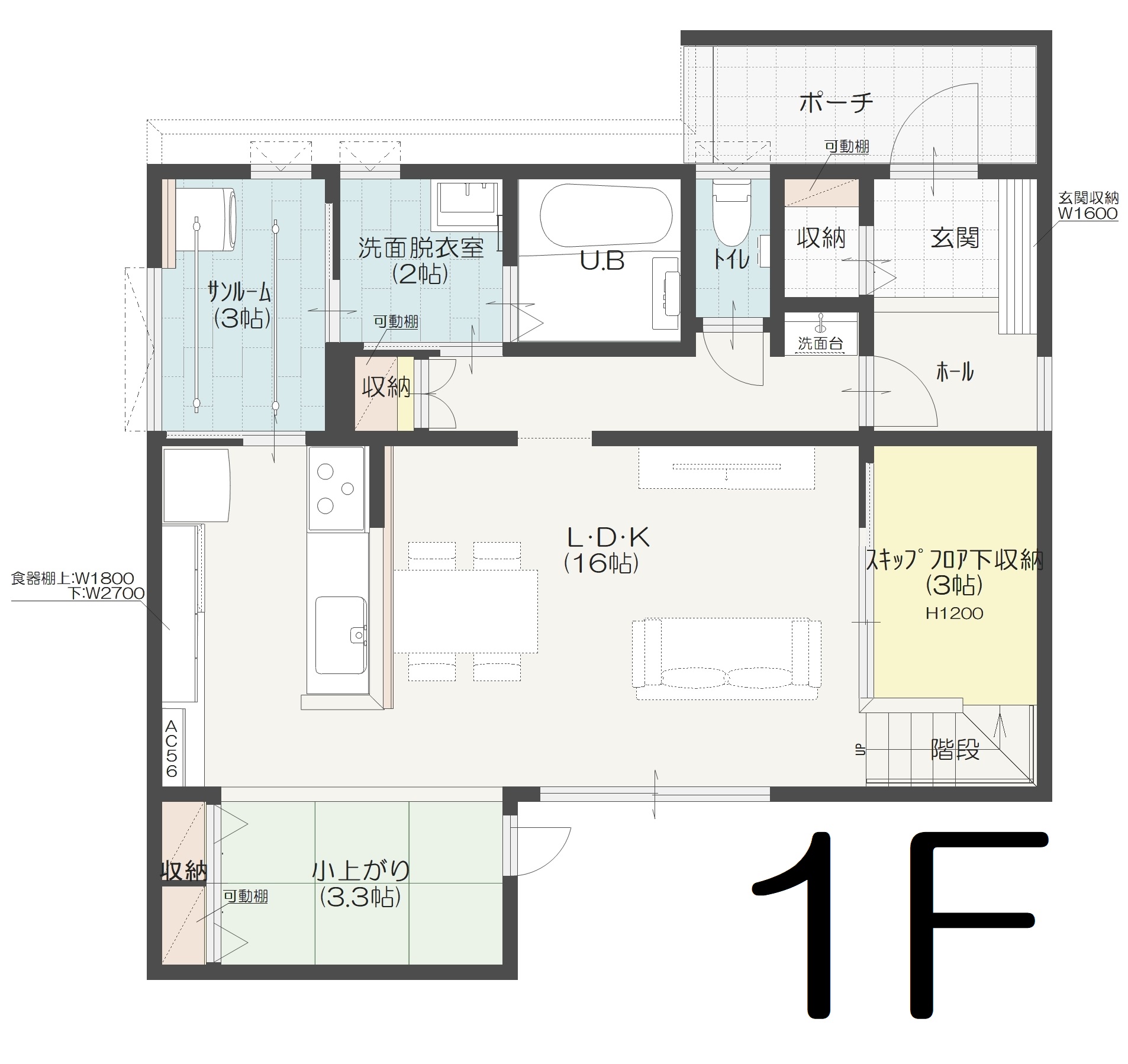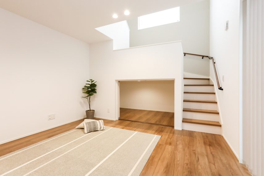 空間に段差を設けることで変化をもたらす「スキップフロア」をつくり、自由に過ごせるように仕上げました。スキップフロアの下は収納として利用できるので収納場所に困りません。帰宅後すぐに手洗い・うがいができるよう、玄関の横・トイレ外に手洗器を設置、雨の多い北陸には必須のサンルームも完備してあるので、洗濯物が多い日もバッチリ干せます◎