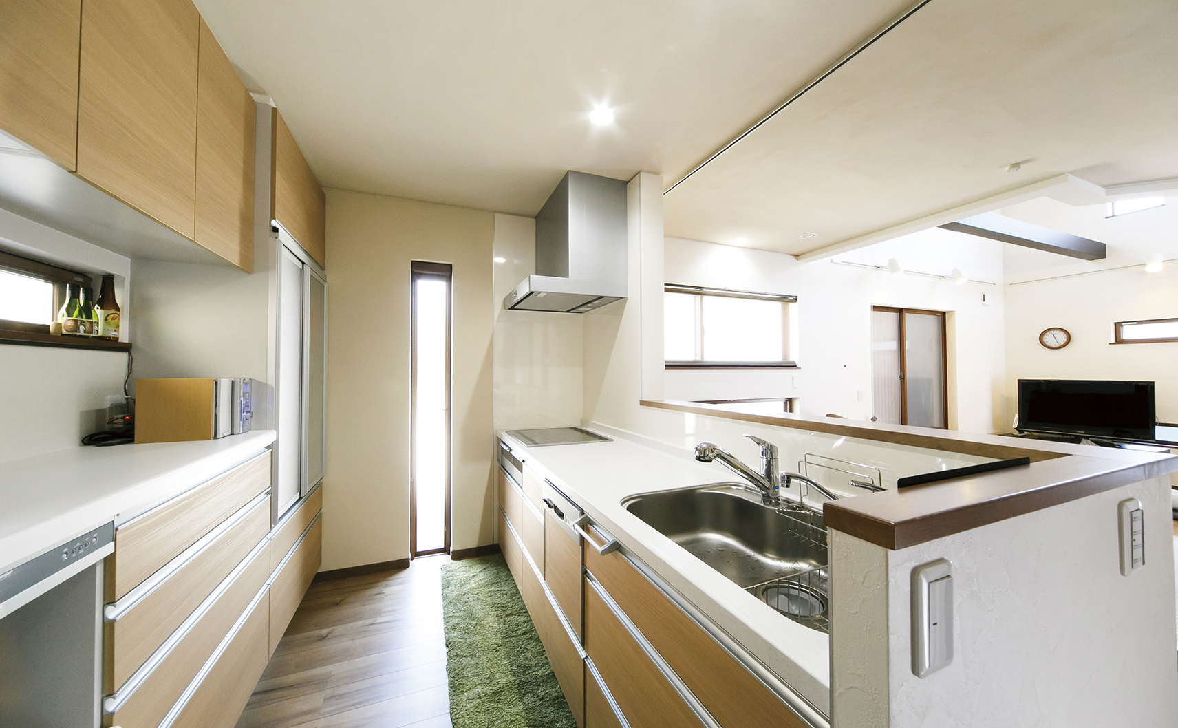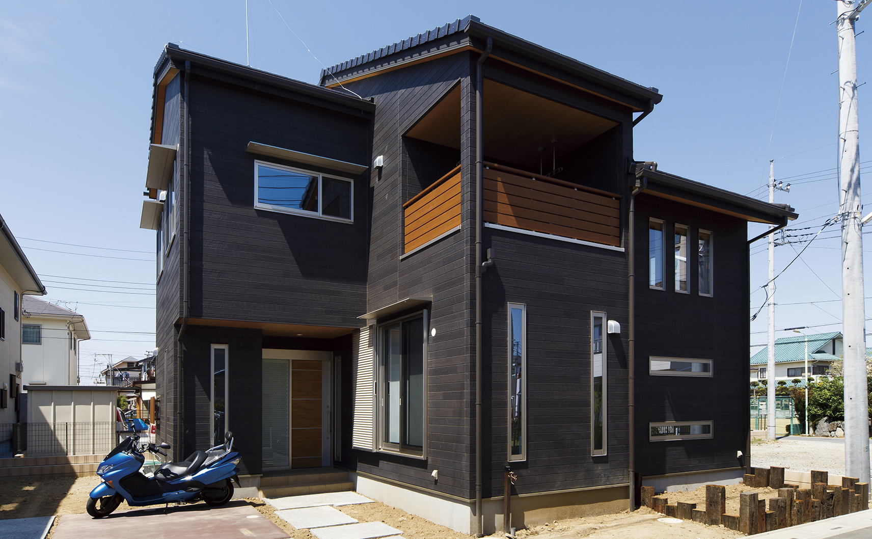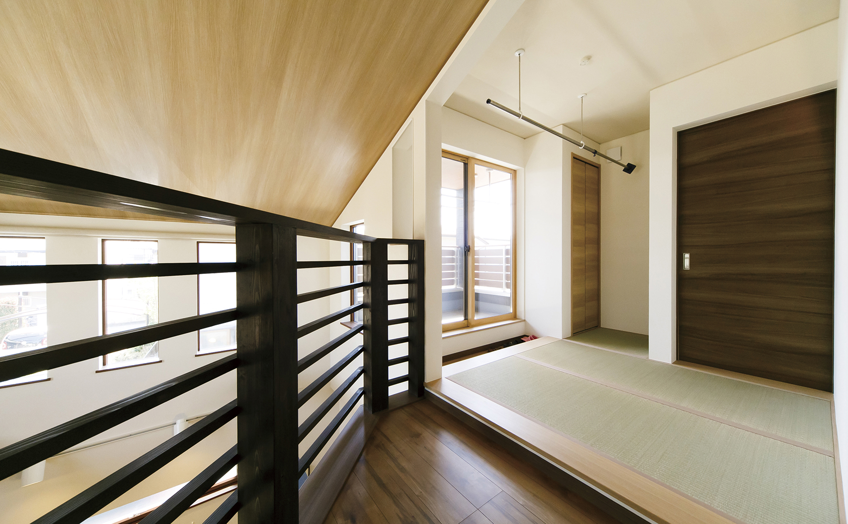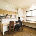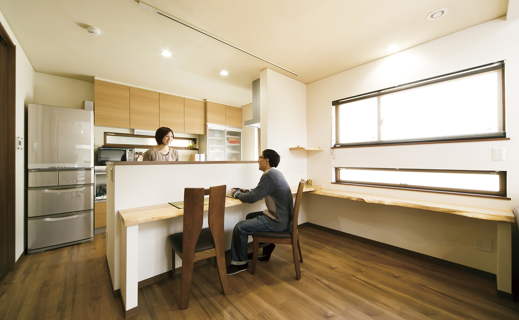 外観は木の雰囲気を感じさせ、内装は和モダンな雰囲気。キッチンカウンターには一枚板を使用したり、内壁には珪藻土を施工、吹き抜けホールの手摺はオリジナルの設計にする等、こだわりがたくさん詰まったお家です。