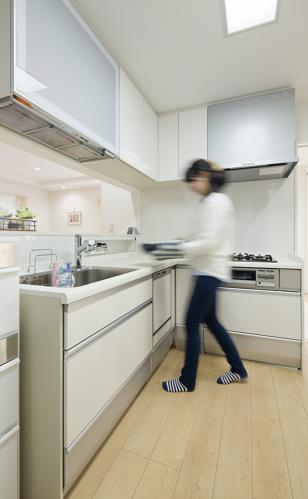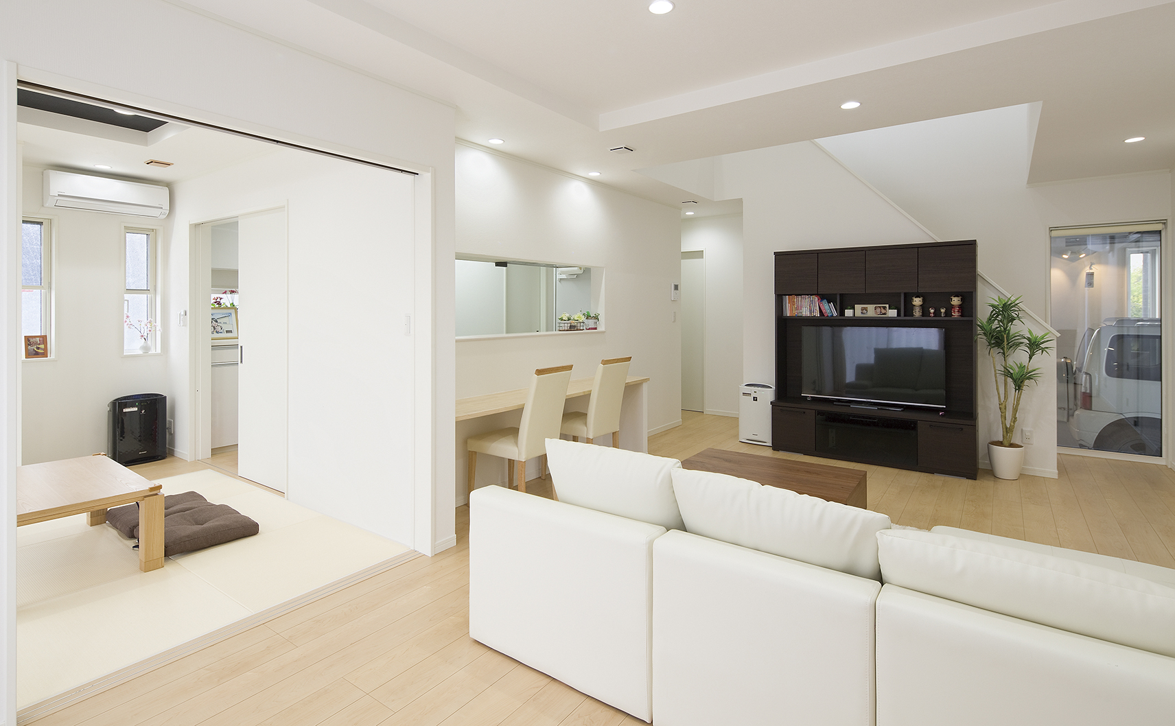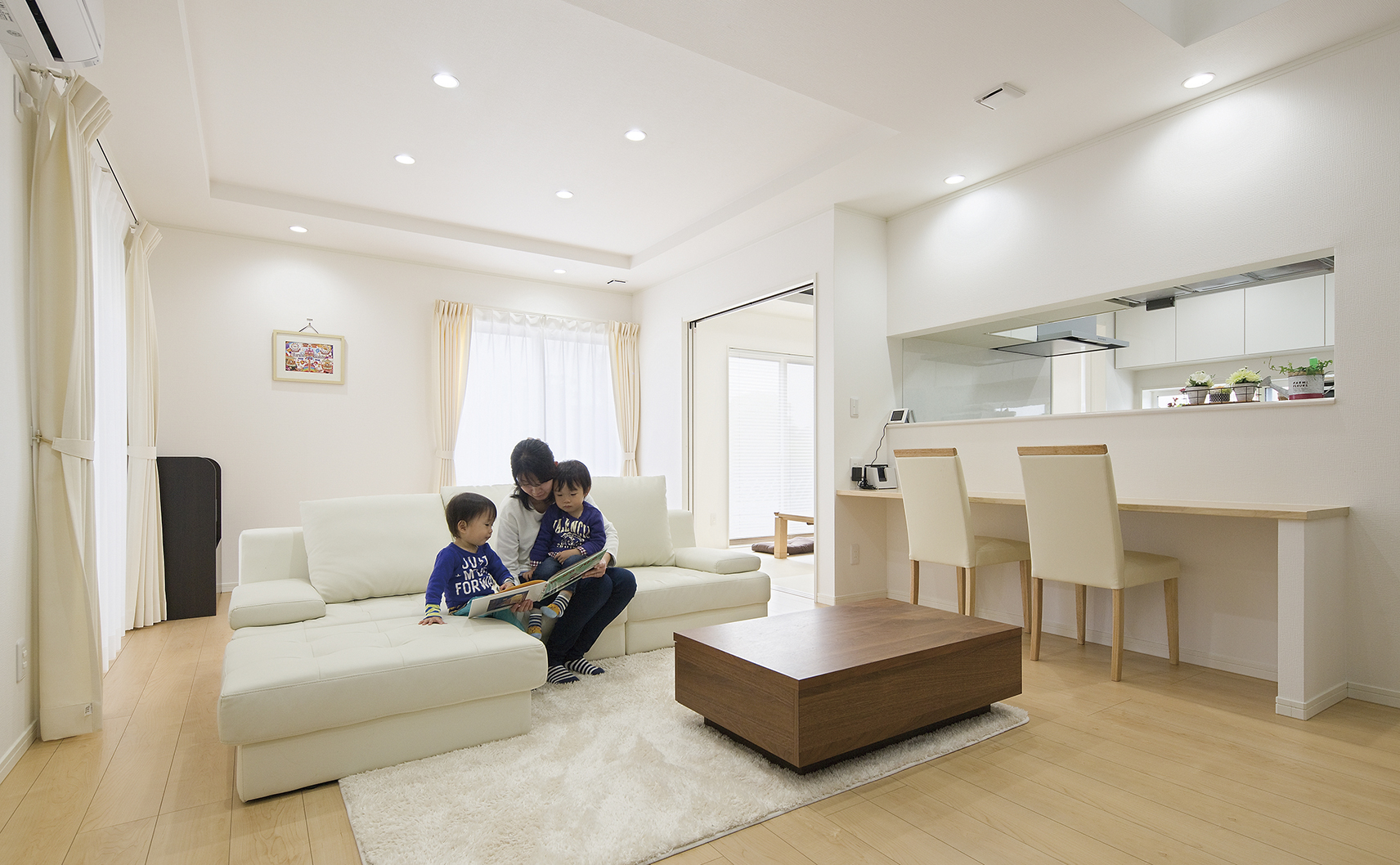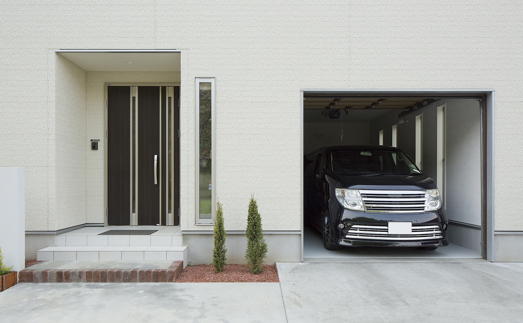 リビングから愛車を眺められるインナーガレージやプライベートテラス、L型のキッチンなど、多彩な空間のつながりで家族みんなが楽しく過ごせる住まいです。