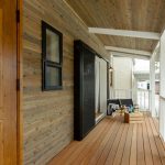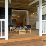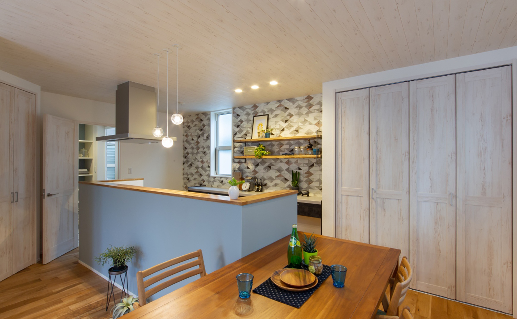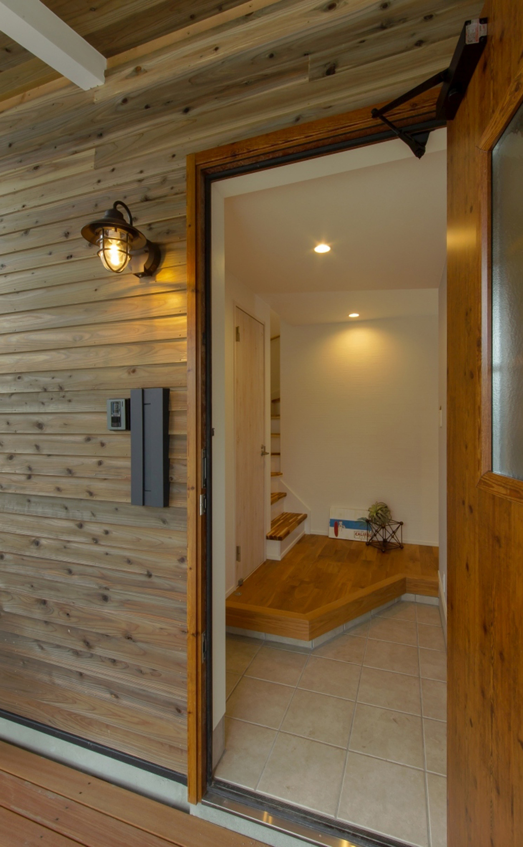 中と外を繋ぐカヴァードポーチは、木のぬくもり溢れる外観を演出。リビングはアンティークな家具や小物が似合う空間に。表し梁や扉、吊り戸棚など色調を統一することで、一体感のあるデザインを実現しています。