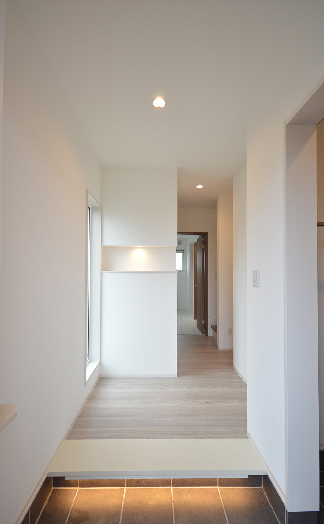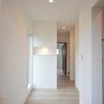 足元の間接照明が迎える玄関