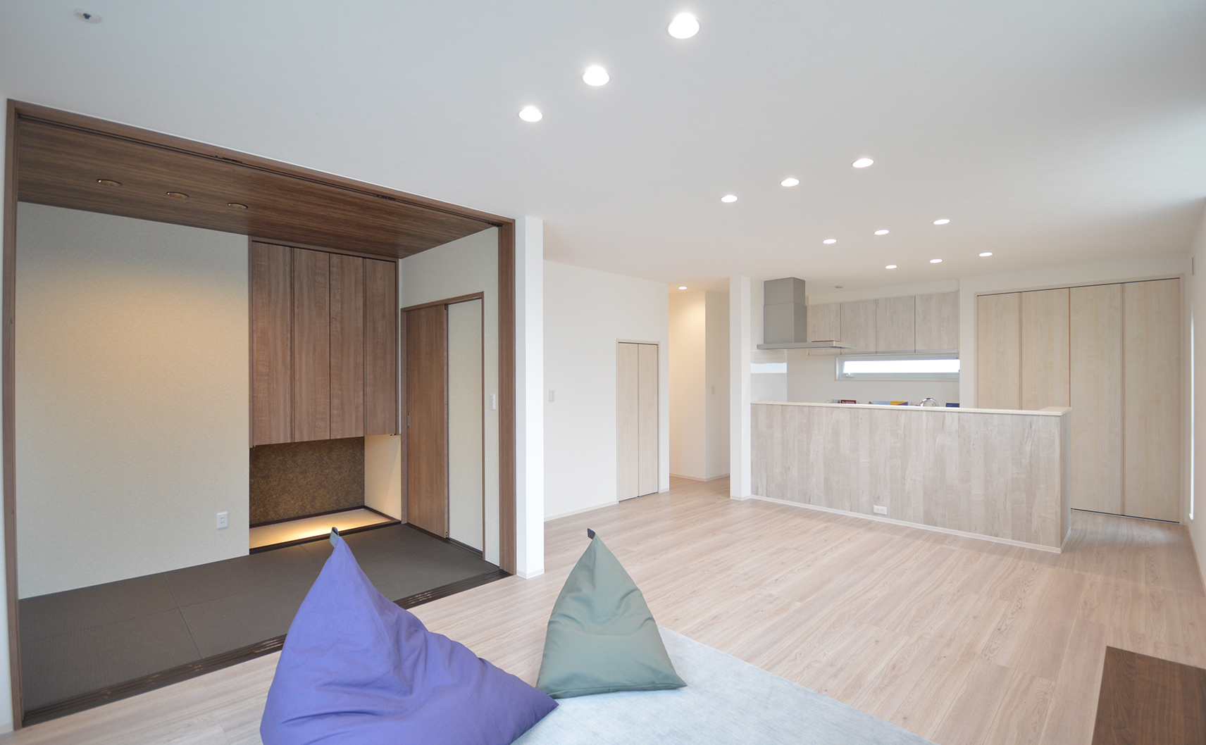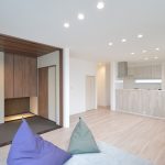 木目と濃い色の和室がアクセントのLDK