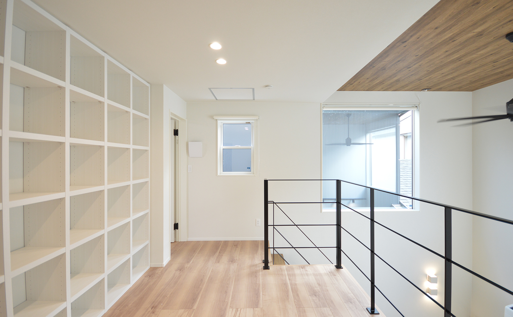 造作収納付きTVボードと組み合わせた階段のステップから延びる鉄骨階段がデザインとして空間を印象付けます。トレーニングルームや2Fホールのフリースペースが生活に余裕をもたらします。