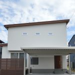 緩やかな片流れ屋根がアクセントの明るい外観