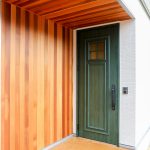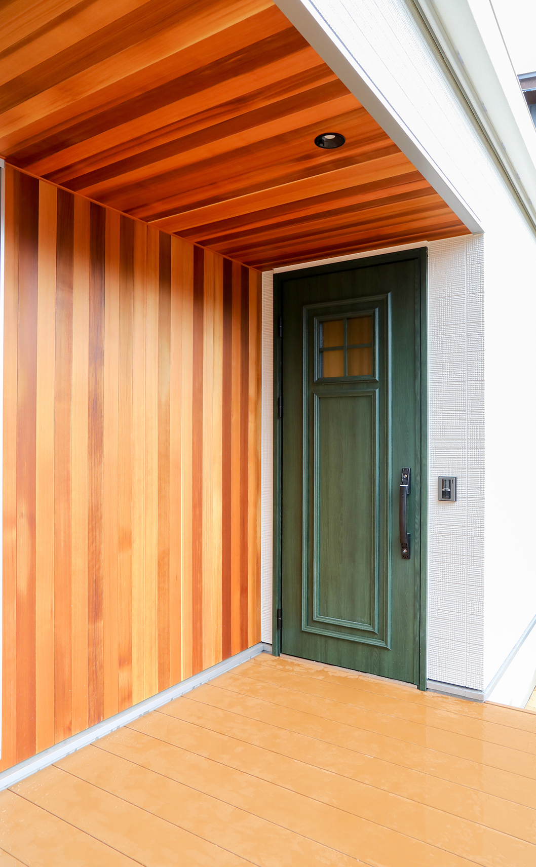 木の雰囲気にグリーンの玄関ドアをアクセントとした玄関ポーチ