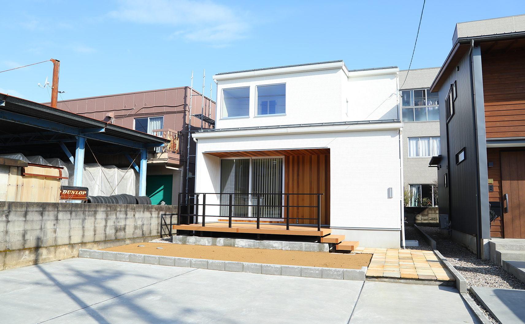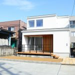 ウッドデッキから入る玄関と木目をアクセントとした外観