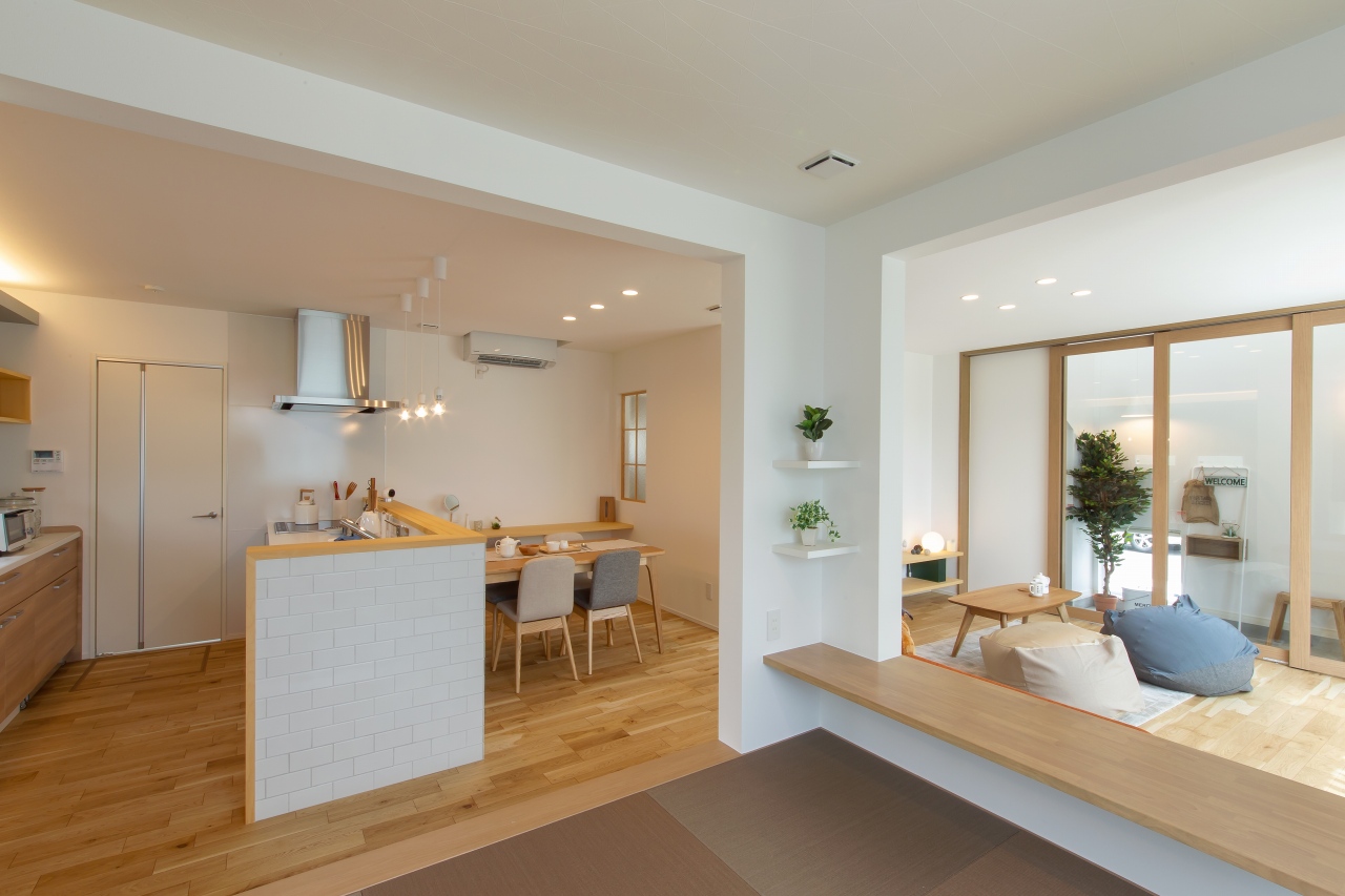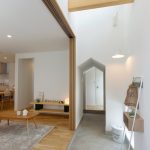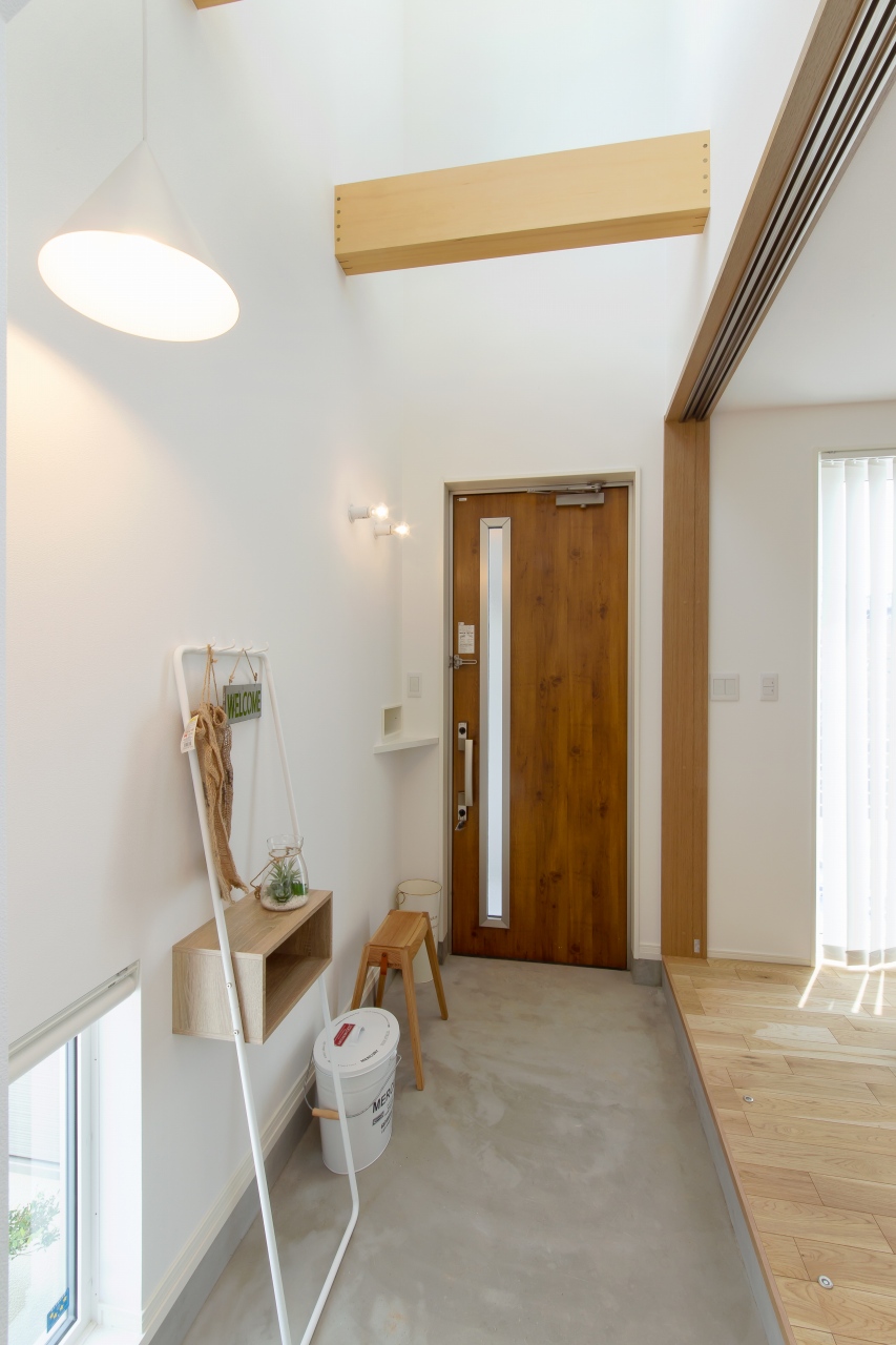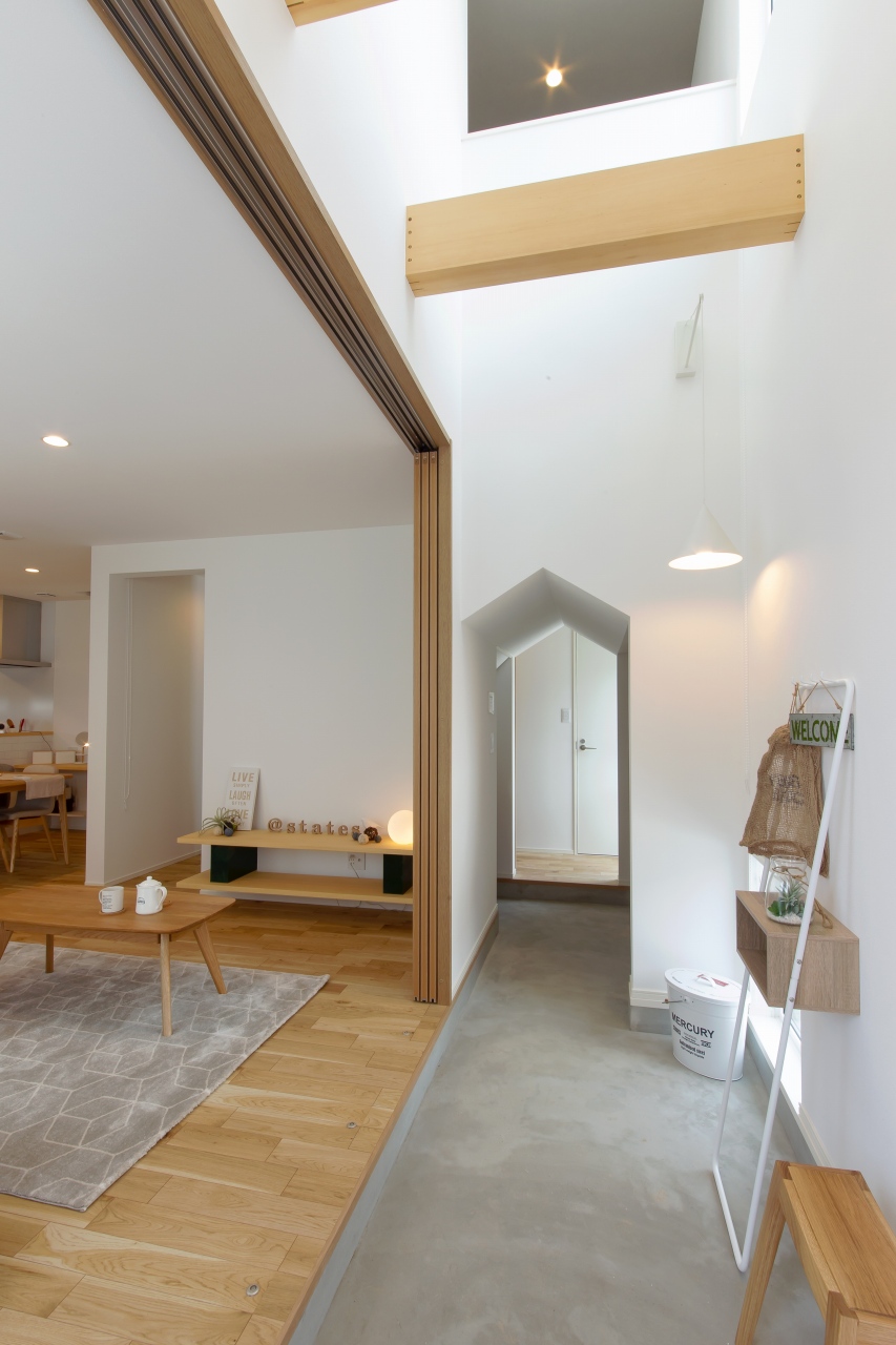 玄関の土間から直接リビングに上がれるお家。広い土間空間は開放して使えるので、玄関でありながらリビングの一部でもあります。