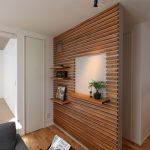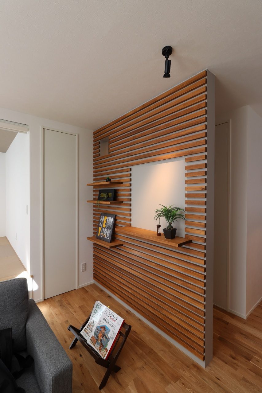 角材のルーバーで飾り棚を可動できるデザイン壁