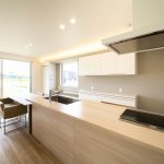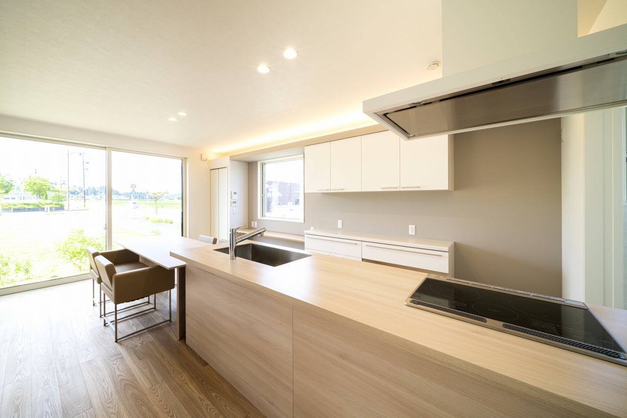 インテリアとして映える、グラフテクトのキッチンとダイニングテーブルを配置した家
