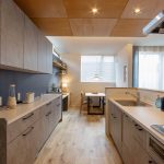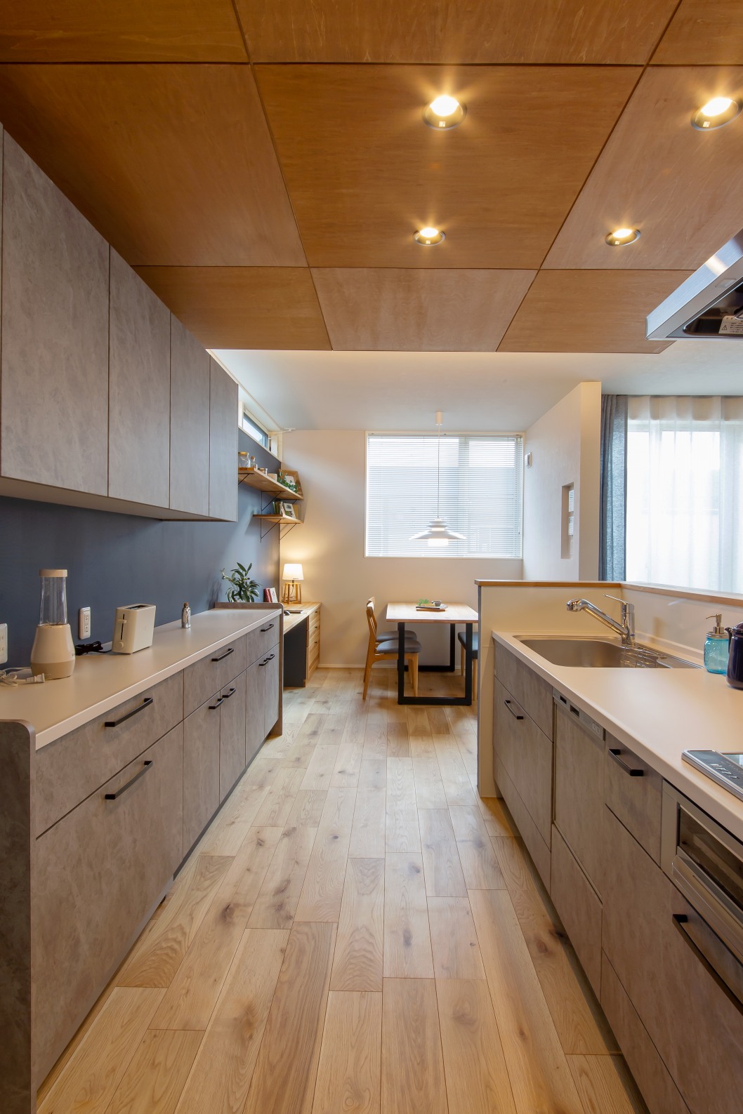 キッチンも無機質なデザインで天井と床の木と調和を図る