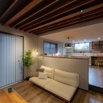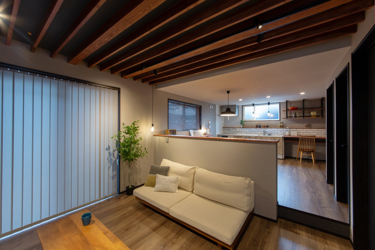 梁とルーバーを組み合わせた天井デザインのリビング