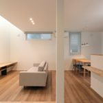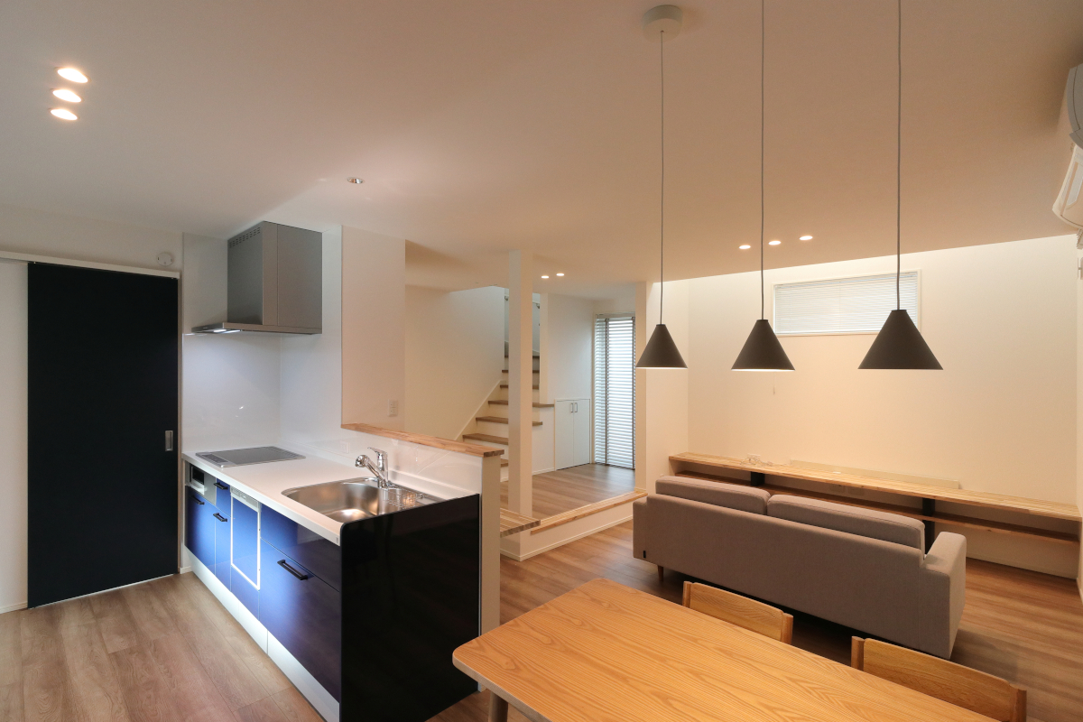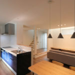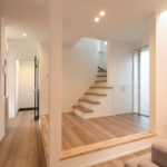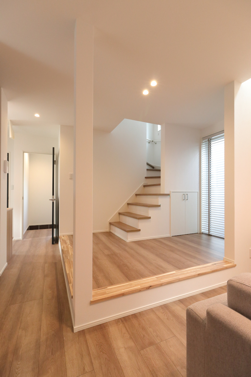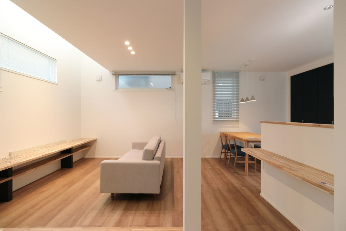 分譲地でプライバシー性を確保しながら、吹抜けで採光、階段横をオープンな小上がりスペースとすることで開放的な空間に。