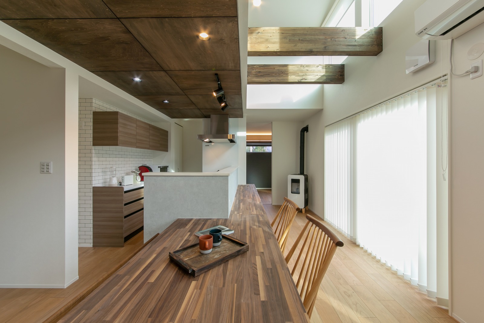 大屋根の屋根裏空間を利用した長い吹抜けは、解放感とたくさんの光を取り込みます。