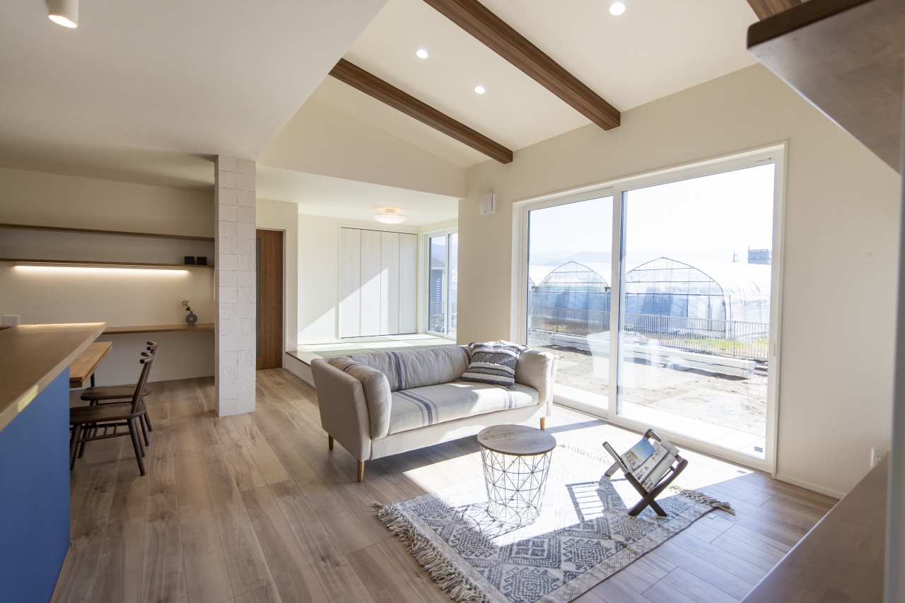 下屋の余剰空間を利用した勾配天井に梁現しを加え、デザイン性と解放感を演出、気持ちの良い空間に。