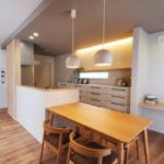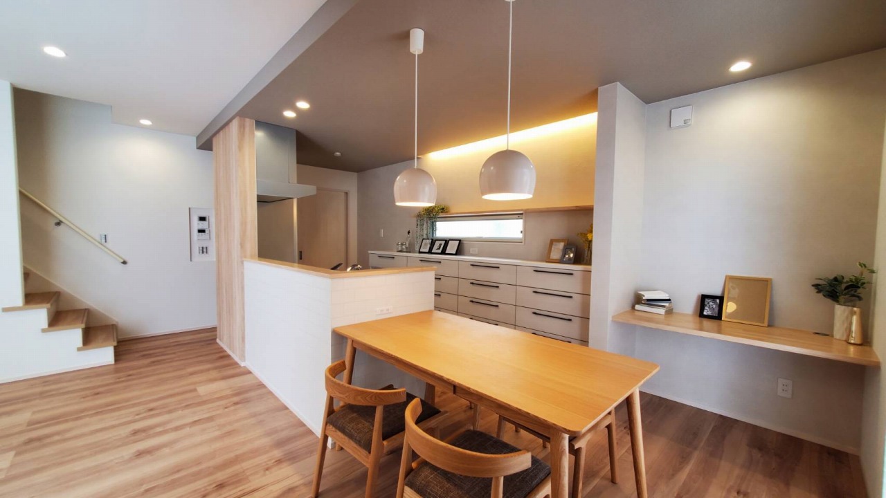 照明器具やアクセントクロスでダイニングキッチンをインテリアとして魅せるお家。