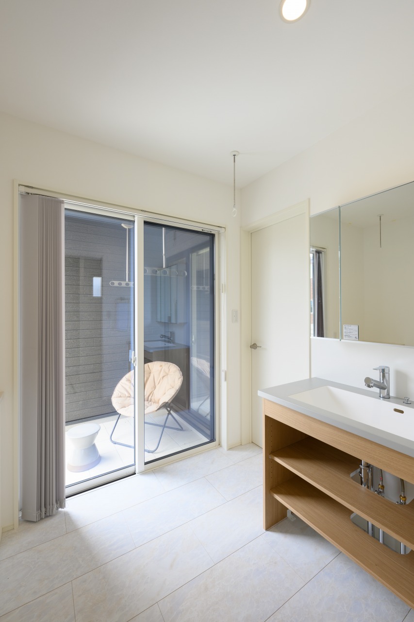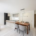 木目を効かせつつ、白い内装で光の反射を狙った、明るい平屋建て。