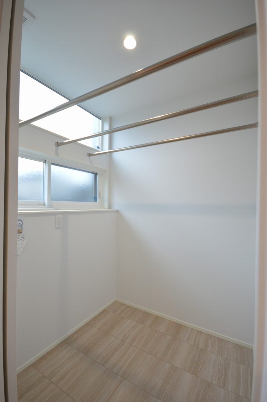 固定パイプを設置したサンルーム。洗濯機を置いて、洗ってすぐ干せる。