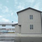 三角屋根の家らしい外観。 黒い屋根が壁まで繋がるデザインで個性をプラス。 外壁は縦張りでグレーの木目を使用し、汚れの目立ちにくい印象に。