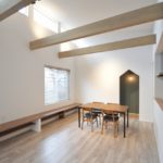 造作TVボードはダイニングまで伸ばし、窓際ベンチとして、ダイニングの増設チェアとしても。