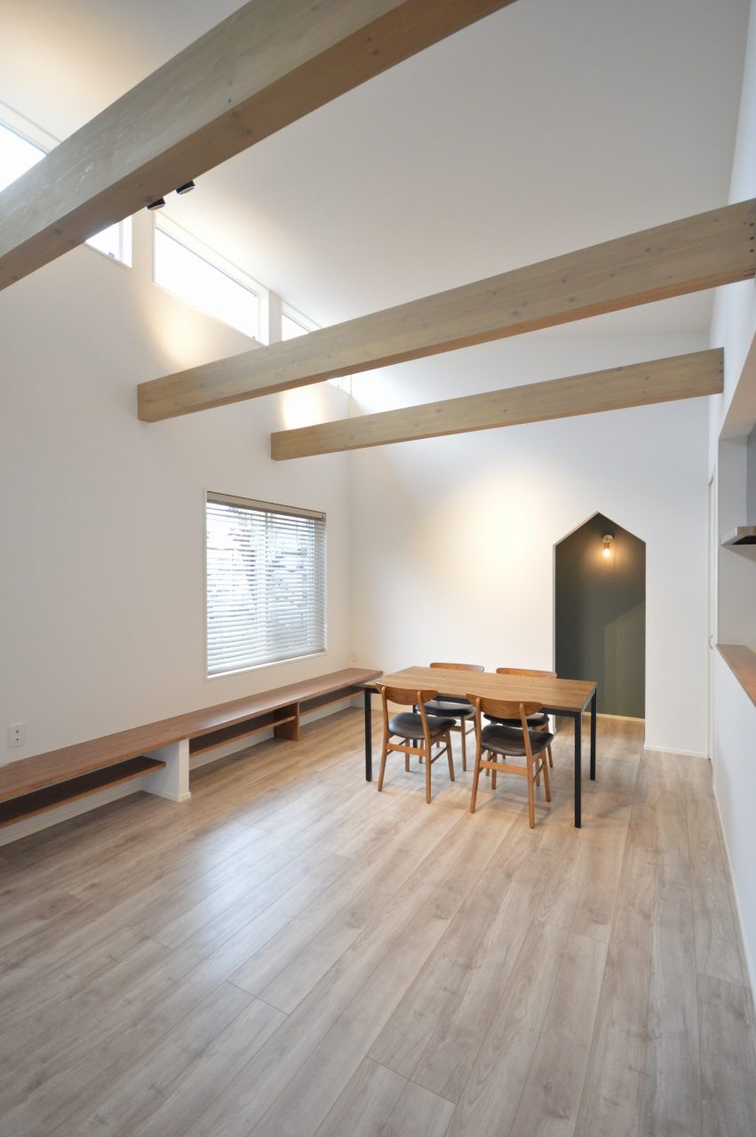 延床面積25坪とコンパクトながら、平屋ならではの勾配天井や視線の抜けを工夫して最大限、開放感を高めた家。 勾配天井とすることで高い位置に窓を設置でき、明るく暮らせます。 カウンターで造作TVボードを作り、ダイニングまで伸ばすことで、窓際ベンチも兼用。 お友達や親御様を呼んでパーティになってもダイニングに椅子を増設できる考えに。
