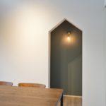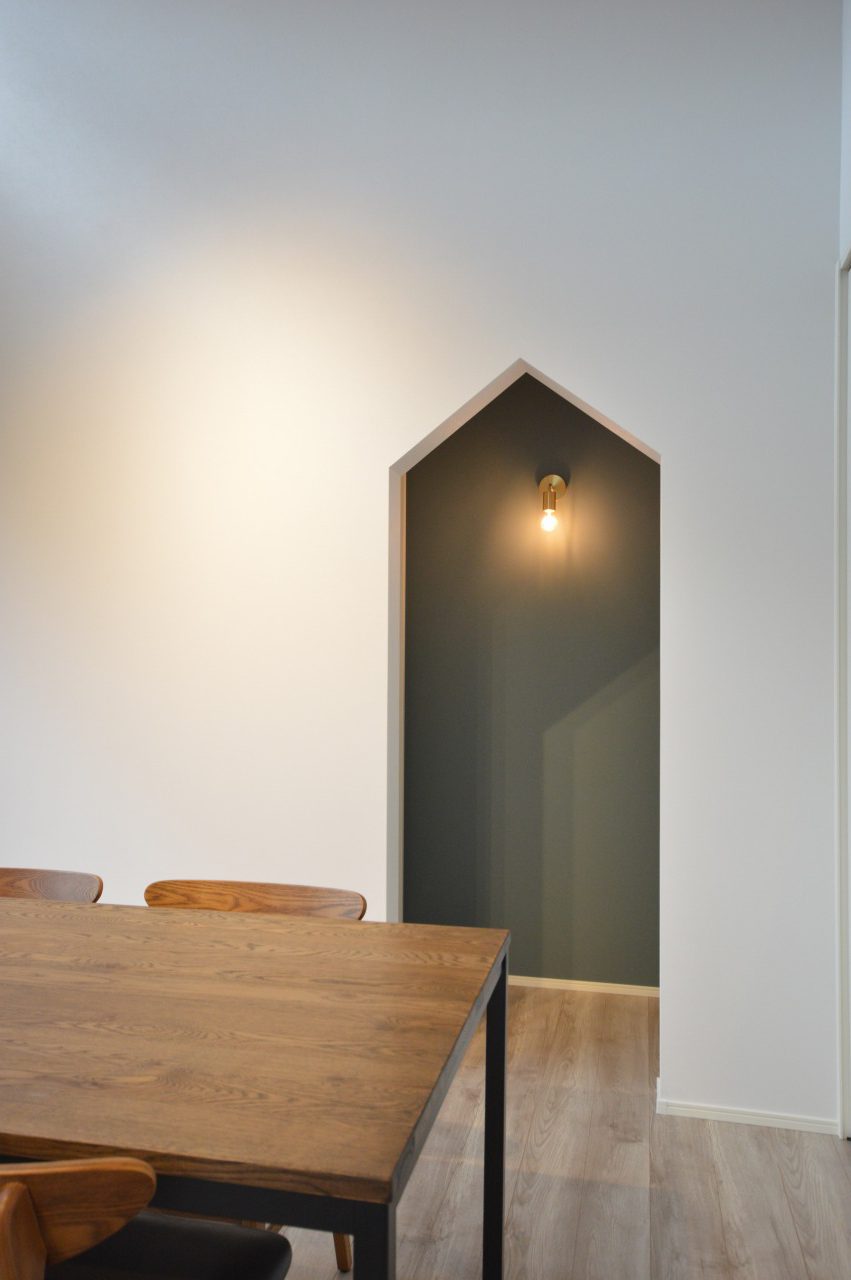 居室への入口はアクセントクロスと真鍮製のライトでインテリアのように。