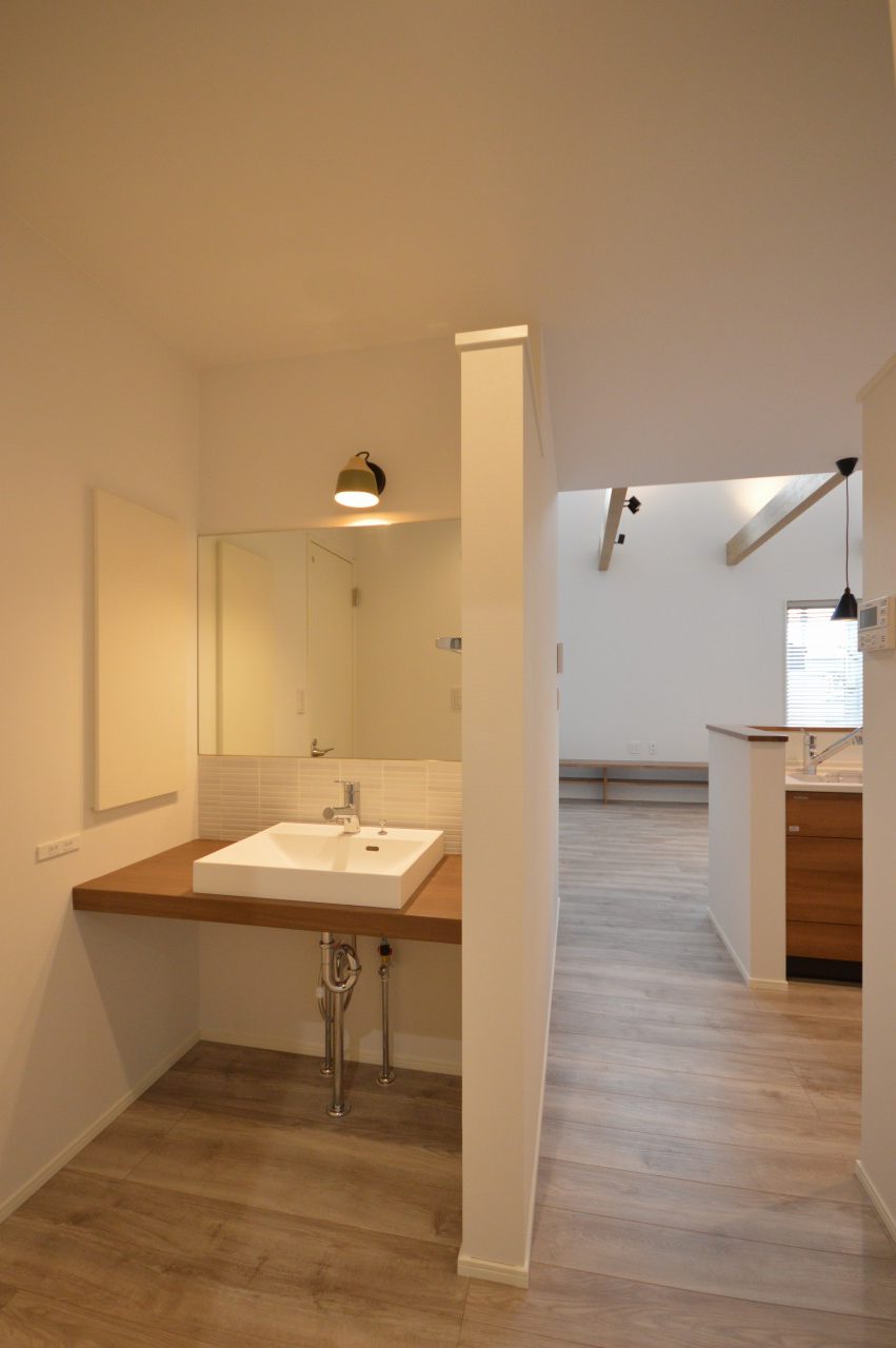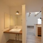 LDKと繋がりながらも死角に位置する洗面スペース。LDKの冷暖房された空間なので快適に身支度。