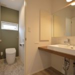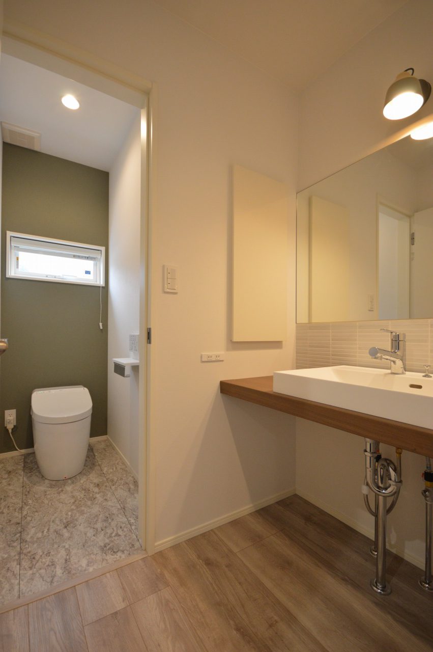 トイレと洗面スペースを隣り合わせに、タンクレスでも手洗いに困らない配置。