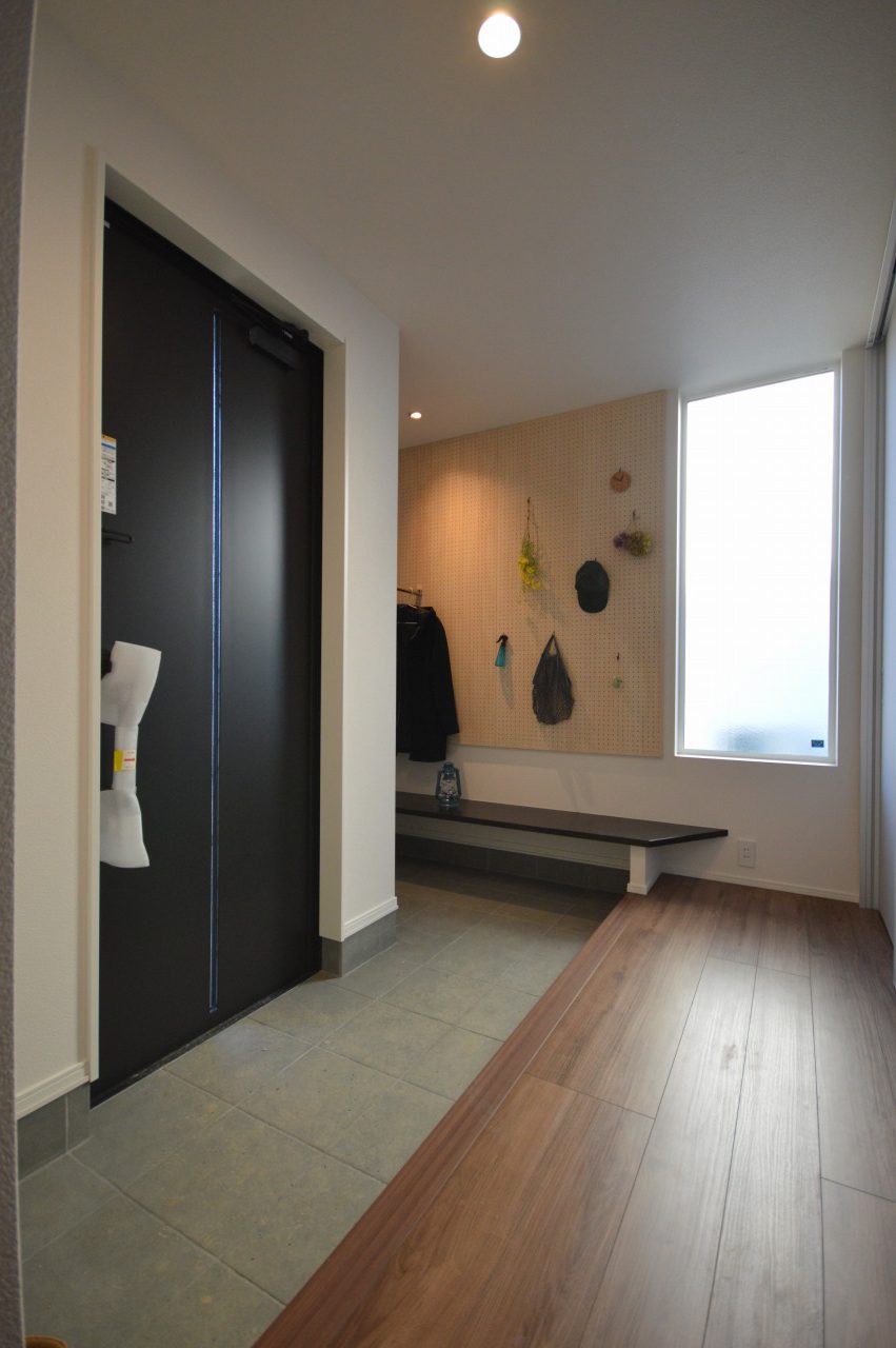 上がり框の間口を取った玄関で使いやすく。奥には有孔ボードでオープンに、フレキシブルに使える収納。死角にはコート掛けがあり便利に。写真右壁面には隠せるシューズ収納も設置。
