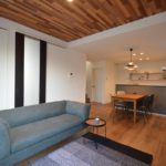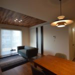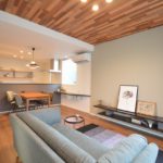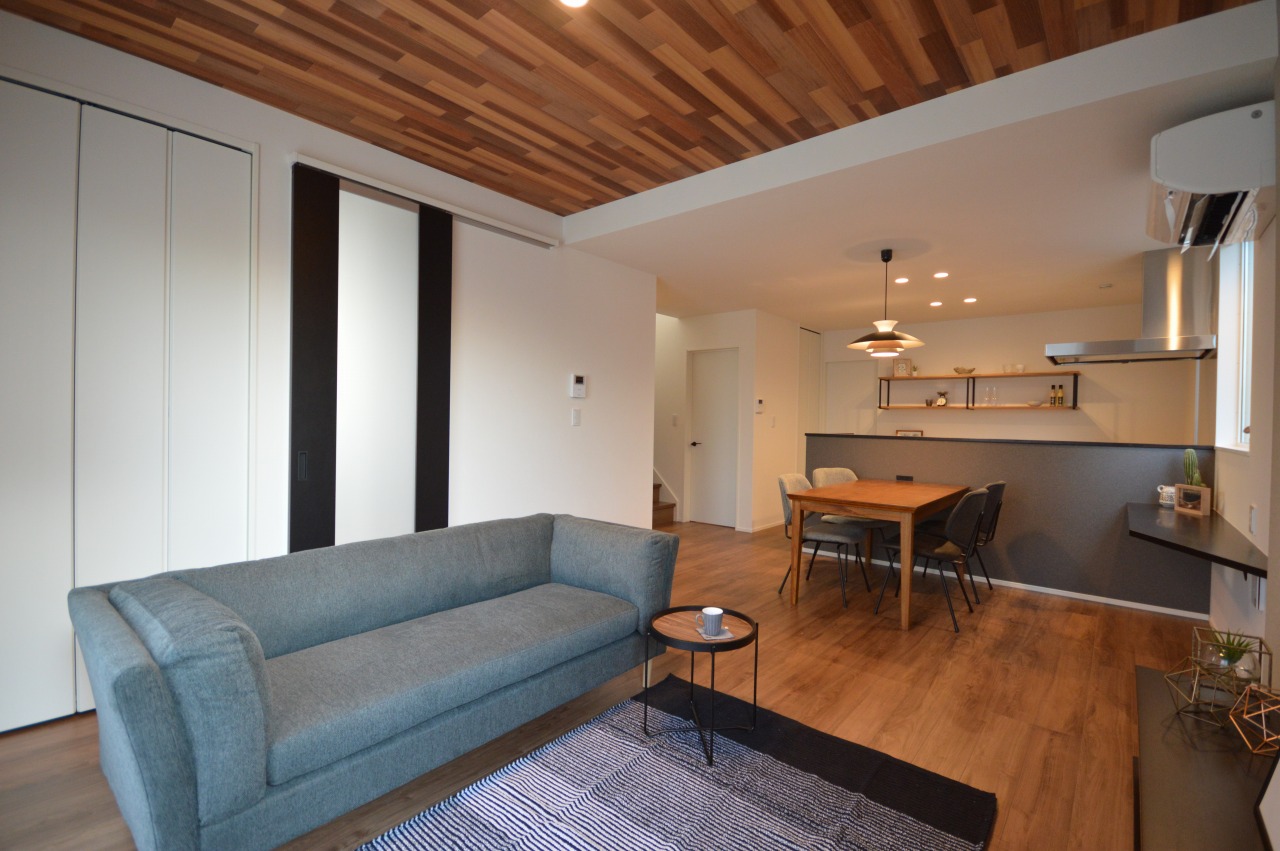 天井板張り風のリアルなクロスで印象的に。天井高2.6mの開放的なリビング。