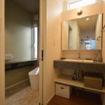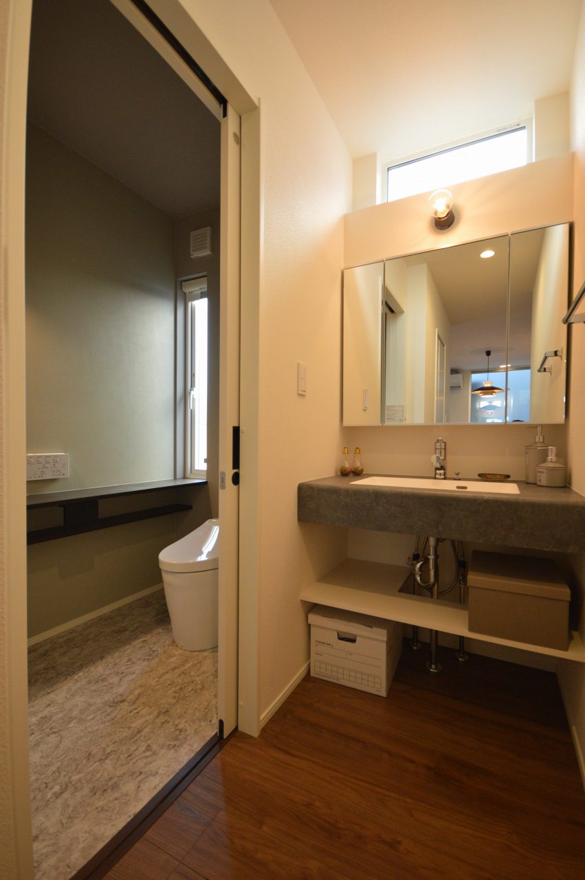 LDKと直結する洗面スペースとトイレ空間。モルタル調のシンクでインテリア性UP。