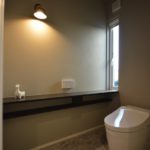 落ち着いた色味のトイレ空間。2段のカウンターの間にはトイレットペーパー市販の12ロールが収まる設計。