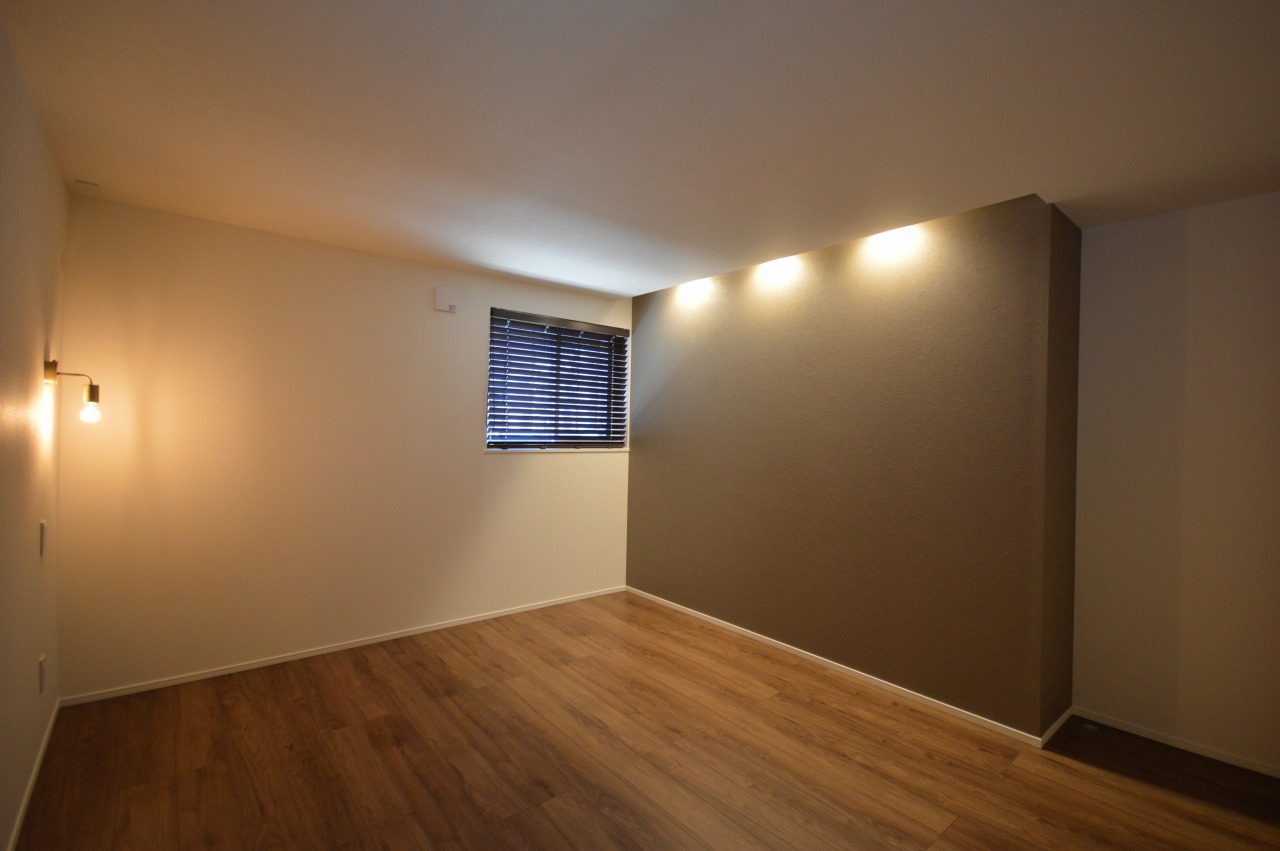1階寝室。明るすぎない照明で夜も適度な明るさに。