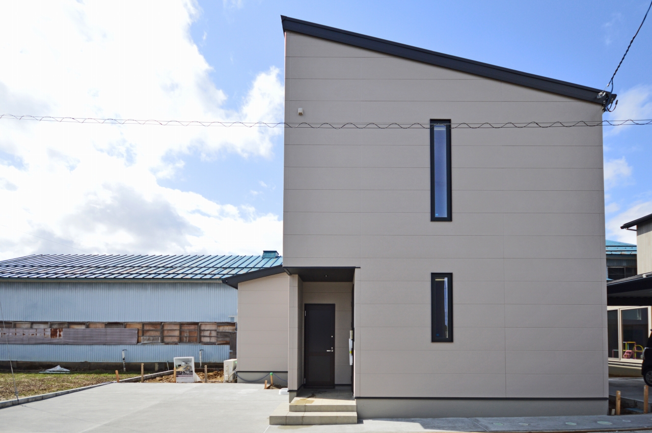 グレーのフラットな外壁にアクセントとなる窓や片流れ屋根の外観。