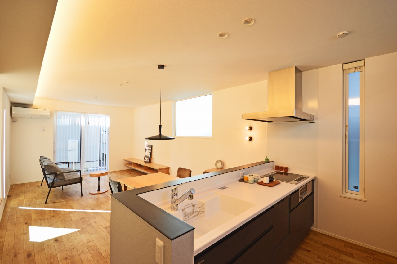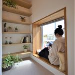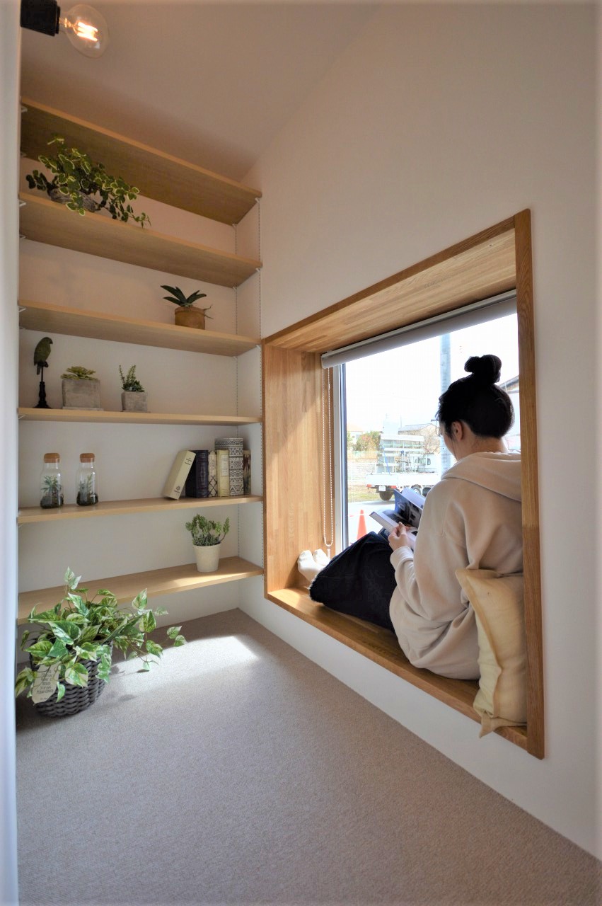 窓枠を幅の広いカウンター材で造ることで窓際に座れるヌックのあるお家。 こじんまりとした空間で安心感をもたらす一人の時間を創造します。 お子さんの遊び場としても、大人のリラックスタイムとしても。家族の誰かの居場所になる空間。 LDKは間接照明がデザインとなり、空間を照らします。