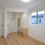 スタディーカウンター兼収納がある子供室。通常はオープンで使いやすく、友達が来たら収納はカーテンで隠せるように。