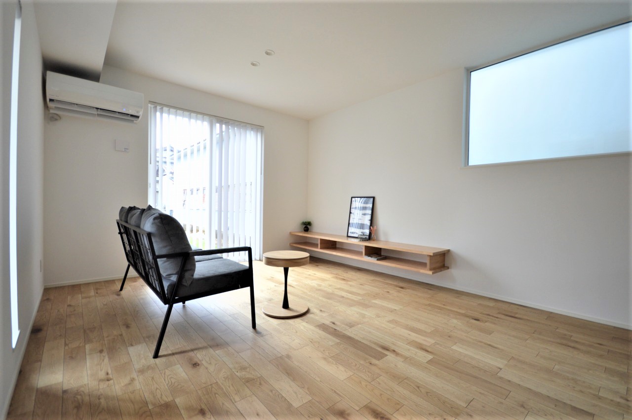 床の自然素材感と、日中の自然光が心地よいリビング。