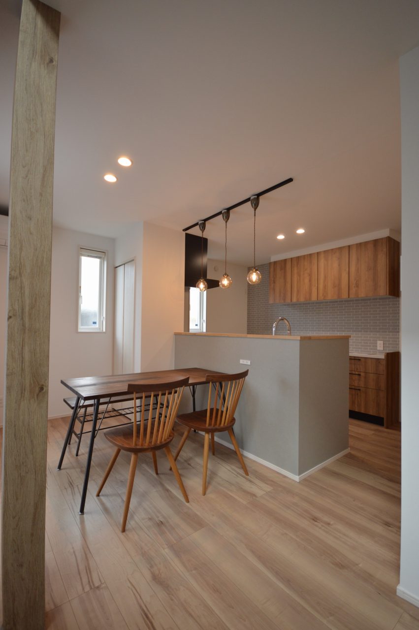 ランドリーに隣接してダイニングキッチンスペース。玄関からキッチンまでスムーズな動線で入ってこれる。ガラスのペンダントライトでおしゃれに演出。
