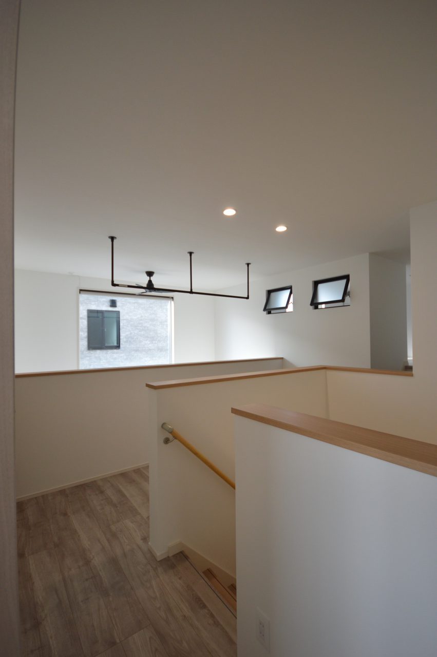 吹抜けの暖気を利用して物干しができる2階ホール。