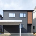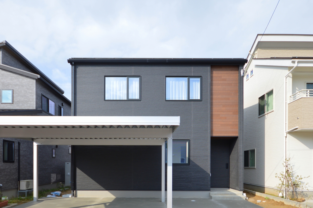 キューブ型のシンプルな外観は玄関上の木目調の貼り分けがアクセントになります。