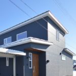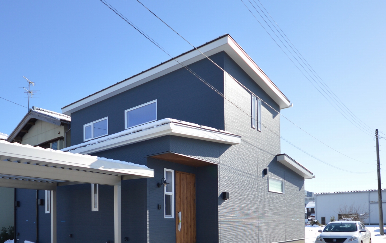ネイビーをベースに白の窓枠や屋根がアクセントになる外観。