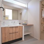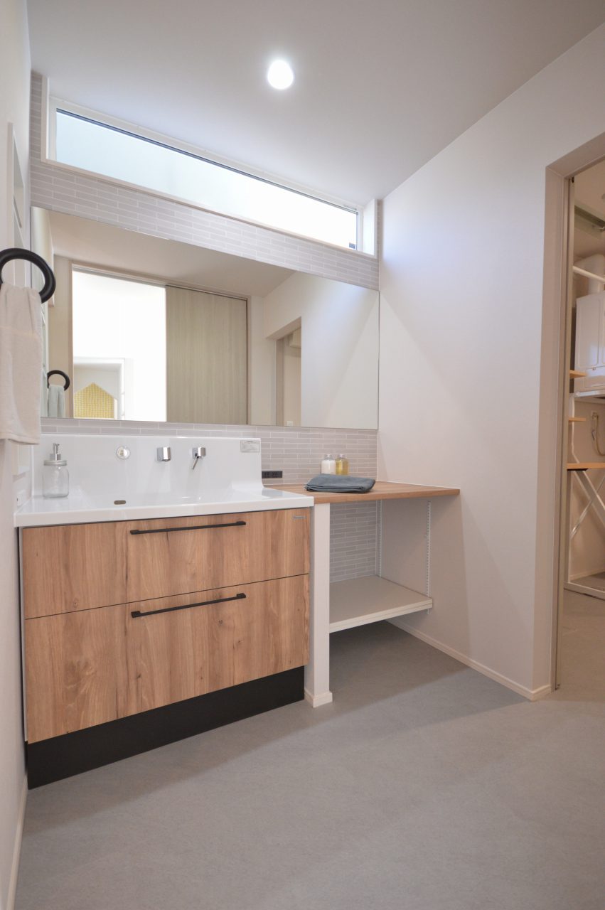 既製品のシンクと棚・ミラーの造作で構成した洗面スペース。