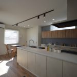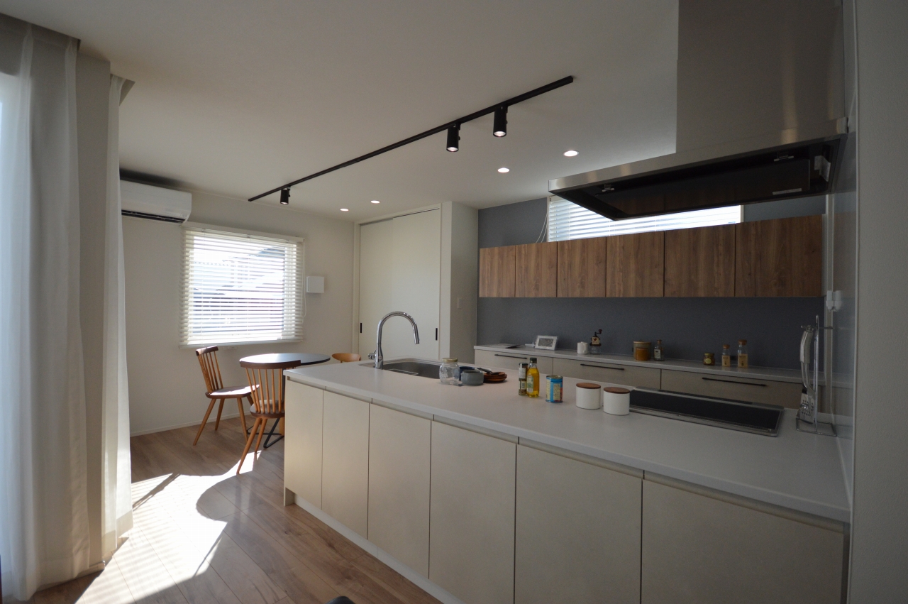 1階に寝室を設け、子供が小さいとき、巣立ってから、1階で生活が完結します。 寝室にはポップインアラジンを設置し、リラックスできる空間に。 LDKは冷蔵庫スペースをキッチンと隣り合わせにまとめ、、そのまとまりとしてアイランドの配置としたキッチンに。