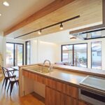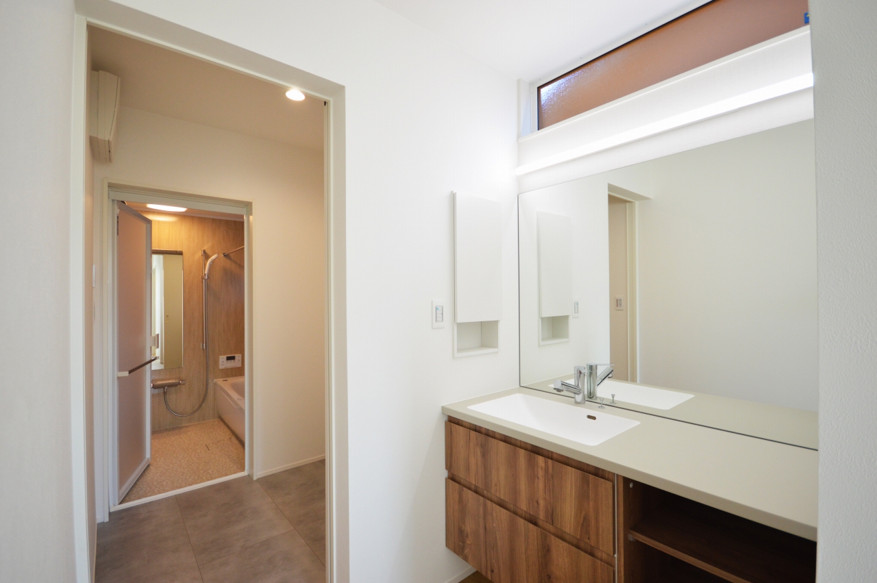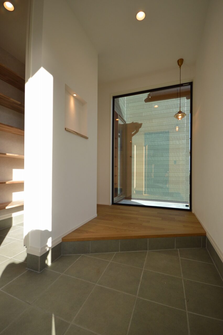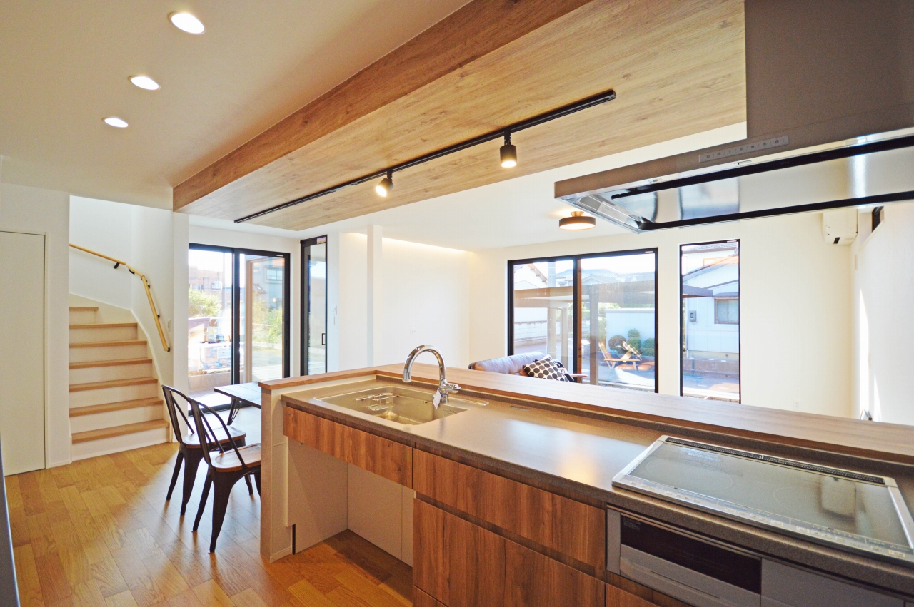 開放的なLDKと坪庭のあるお家。 玄関を入ると大きな窓から坪庭が見え、視線が抜けることで開放的な玄関に。 また、LDKからも坪庭が見え、明るさと開放感を得られます。 LDKは21.1帖あり、面積的にも視覚的にも開放感を演出。 ダイニングキッチンの下がり天井と、キッチン周りの木目をこだわり、ダイニングキッチンがインテリアの一部でデザイン性を演出します。 水回りはサンルーム→トイレ洗面空間→脱衣室→浴室と一直線の動線で家事ラクに。
