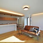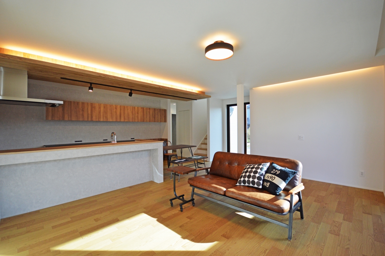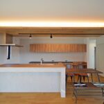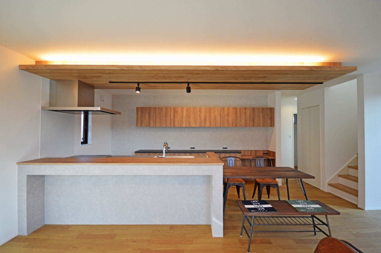天井の間接照明と、下がり天井の木目、キッチンカウンターはキッチンのパネルと色を合わせて木目が映える空間に。