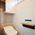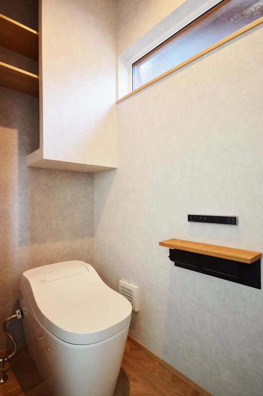 デザイン的に配置した背面の造作で収納力もあるトイレ。