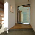LDKからも坪庭が見え、開放的に感じる。入口ドアもガラス戸で開放的に。