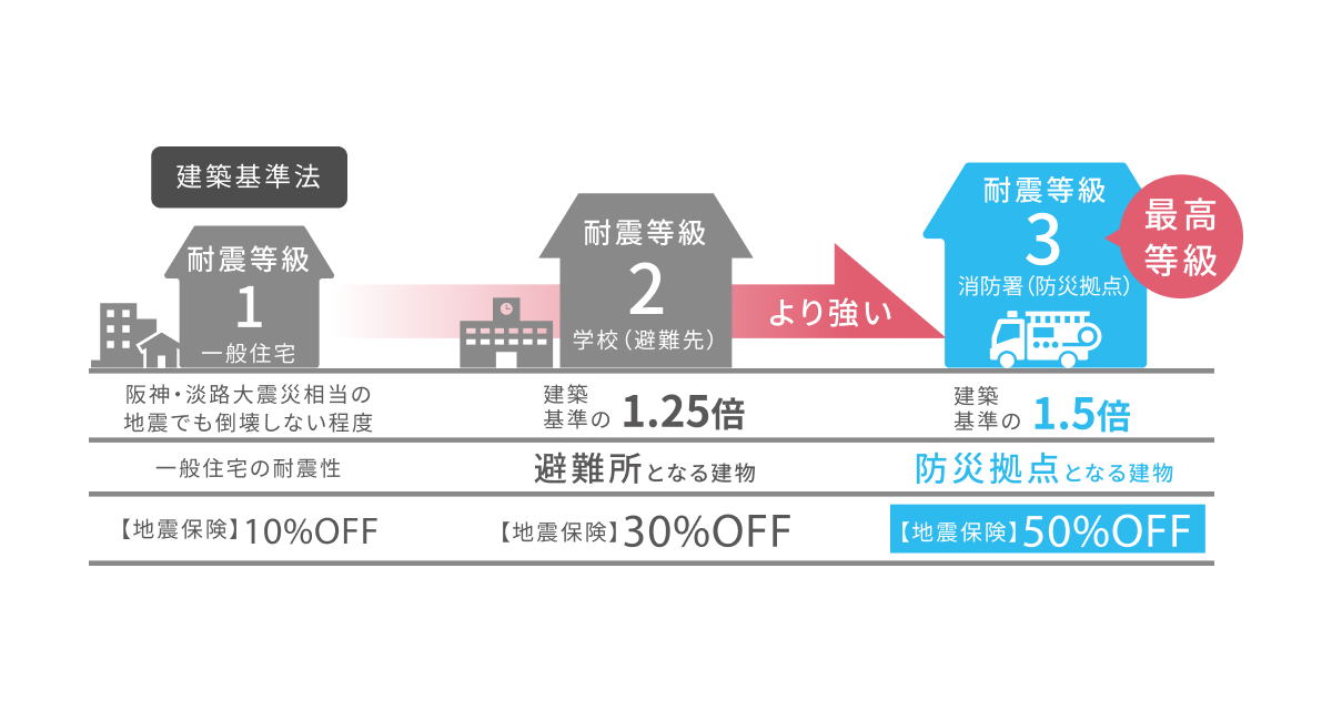 消防署・警察署など災害時の拠点となる建物の耐震基準にもなっており、建築基準法(耐震等級1)の1.5倍の耐震性がある。