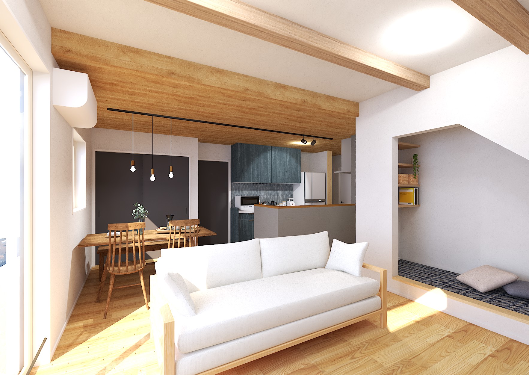 リビングの折上天井と梁あらわしで特別感のある空間を演出。造作TVボード・造作洗面台で上質な仕上がりに。階段下の「ヌックスペース」は一人でくつろげる特別な居場所です。