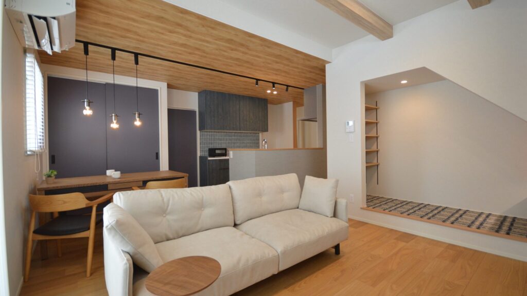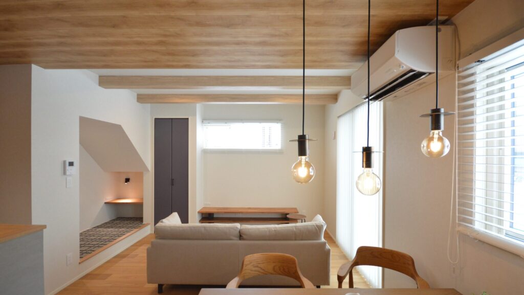 リビングの折上天井と梁あらわしで特別感のある空間を演出。造作TVボード・造作洗面台で上質な仕上がりに。階段下の「ヌックスペース」は一人でくつろげる特別な居場所です。